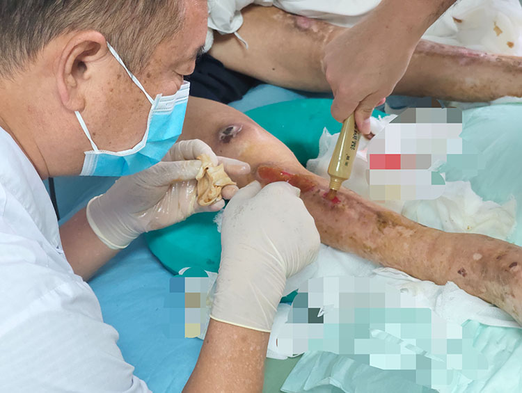 2025年9月25日,《中國(guó)燒傷創(chuàng)瘍雜志》常務(wù)編委、燒傷創(chuàng)瘍?cè)偕t(yī)療技術(shù)臨床專家趙瑞慶在朔州市大醫(yī)院會(huì)診了四例慢性創(chuàng)面患者。其中1例4級(jí)糖足,其余3例冠脈搭橋術(shù)后下肢取血管處感染,足部外傷感染等均為VSD治療患者,討論環(huán)節(jié)趙教授強(qiáng)調(diào)了糖足規(guī)范,程序操作的要求以及簡(jiǎn)易負(fù)壓方法壓力管理的重要性。