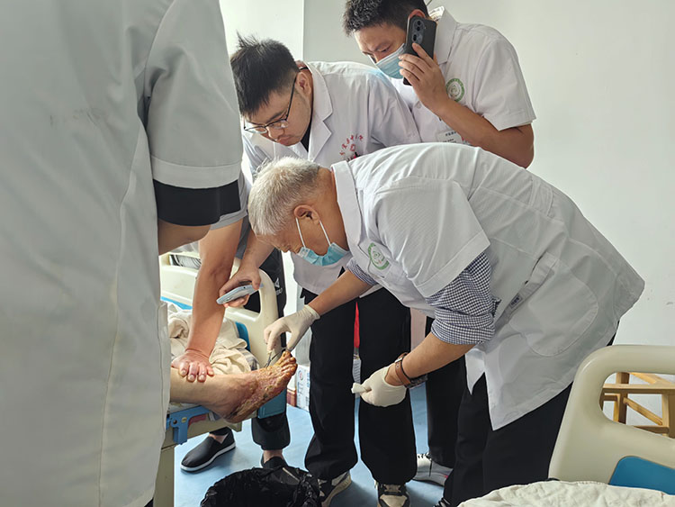 第二站到訪枝江市區(qū),左師傅因右下肢皮膚潰瘍一年多,表皮缺損逐漸變大入住科室。創(chuàng)面治療以手術(shù)+美寶再生醫(yī)療技術(shù)等多方法聯(lián)合應(yīng)用,出院時(shí)創(chuàng)面缺損明顯縮小,無滲液無感染,新生肉芽生長良好,患者自行居家換藥觀察。李主任和余護(hù)士長一起檢查創(chuàng)面,并指導(dǎo)家屬規(guī)范換藥,勤換藥,不適隨診。護(hù)士長同老人交流了創(chuàng)面護(hù)理及心理輔導(dǎo),患者及家屬感動不已。