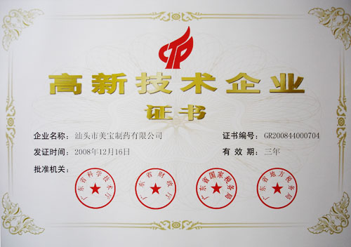 汕頭市美寶制藥有限公司是美寶國(guó)際集團(tuán)在汕頭經(jīng)濟(jì)特區(qū)創(chuàng)辦的高科技制藥企業(yè),日前被廣東省科技廳等四家單位共同認(rèn)定為2008年第一批高新技術(shù)企業(yè),并于2008年12月16日頒發(fā)了證書(shū)。