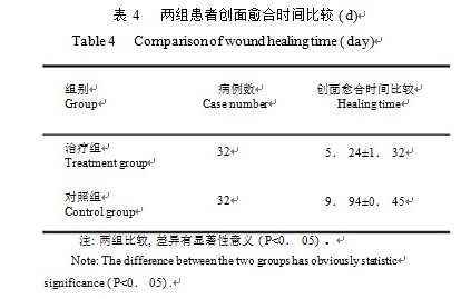 治療組出現(xiàn)暫時(shí)性色素沉著 1例, 紅斑 2例,均 1月內(nèi)消退。對照組出現(xiàn)暫時(shí)性色素沉著 2例,紅斑 3例, 均1月內(nèi)消退。兩組創(chuàng)面均未見感染、未見增生性瘢痕和過敏現(xiàn)象等。