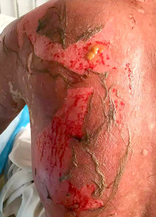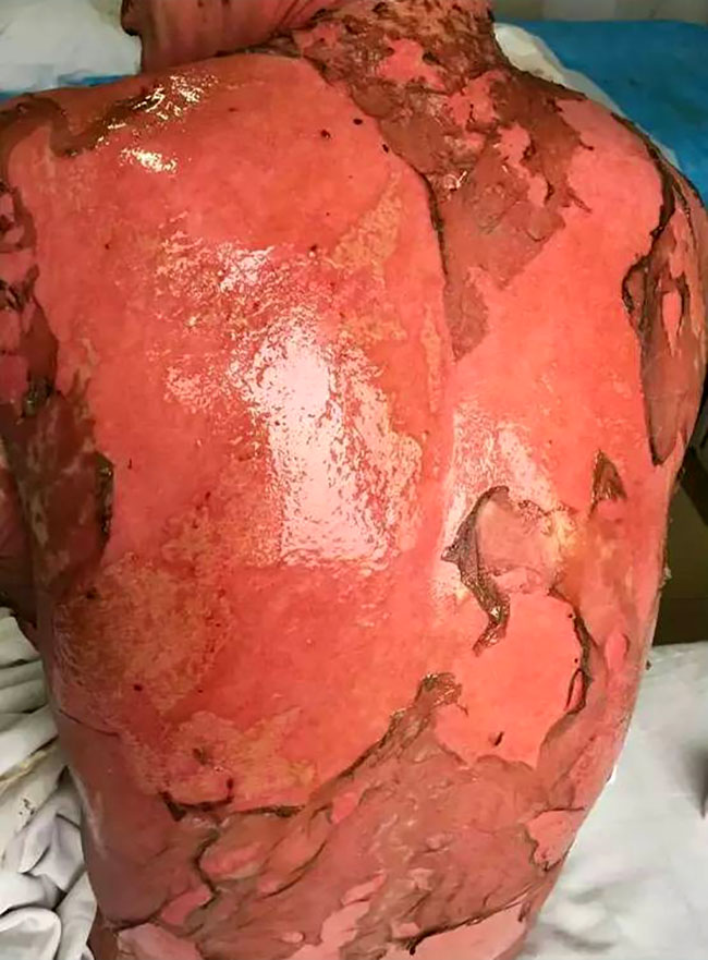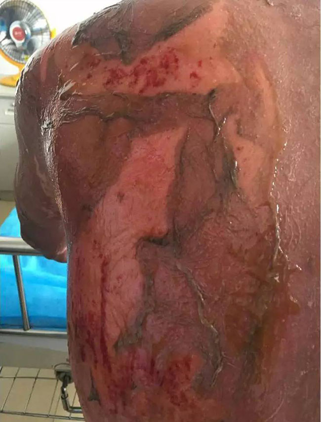 創(chuàng)面可見(jiàn)新生的粉紅色上皮組織,患者全身大部分皮膚恢復(fù)情況較好。