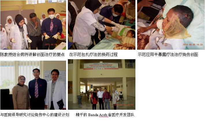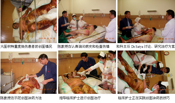 3、8月3日下午,陳教授一行完成了在Fatmawati hospital的培訓(xùn)任務(wù)后,馬上又應(yīng)邀到雅加達(dá)市的Harapan Bunda hospital會(huì)診、指導(dǎo)一例大面積特重度燒傷的患者。該患者是一名男性,47歲。因被火焰燒傷全身而入院。臨床診斷:1、大面積特重度燒傷(75%TBSA深I(lǐng)I度---深I(lǐng)II度);2、中度吸入性損傷。由于患者燒傷面積大、深度深,且是該院收治的第一例特重度燒傷患者,為了更好地使用燒傷再生醫(yī)學(xué)技術(shù)治療該患者,醫(yī)院特地邀請(qǐng)陳教授對(duì)該患者進(jìn)行會(huì)診和指導(dǎo)。陳教授到了病房后首先聽取了病情匯報(bào),然后認(rèn)真詢問了病史、查閱了病歷資料、護(hù)理記錄和進(jìn)行了細(xì)致的體格檢查,并結(jié)合該病例的具體傷情和情況,提出了一整套具體的全身系統(tǒng)治療和創(chuàng)面治療方案。討論和制定了治療方案后,陳教授親自為大家示范了深度燒傷痂皮的耕耘減張技術(shù)和燒傷濕潤(rùn)暴露療法的創(chuàng)面治療方法。