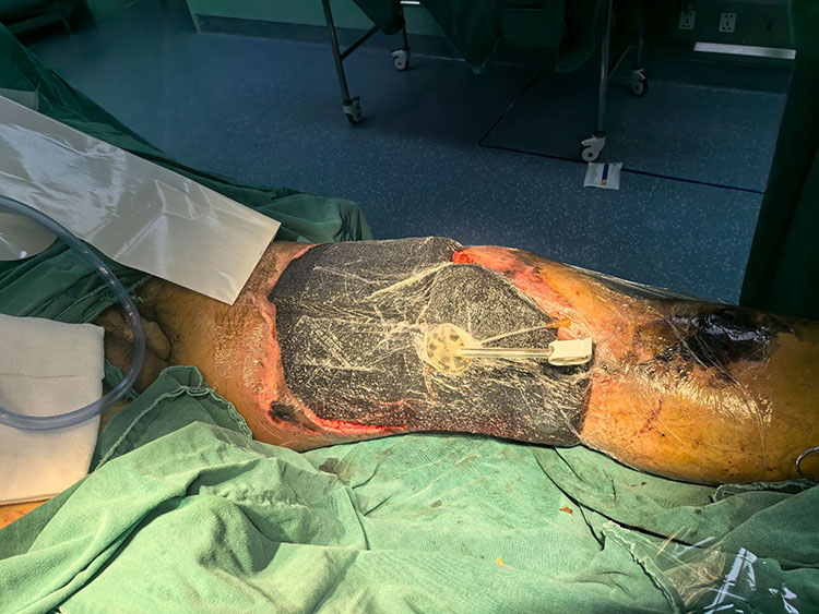 10月10日,應(yīng)長(zhǎng)治市人民醫(yī)院急診邀請(qǐng),《中國燒傷創(chuàng)瘍雜志》常務(wù)編委、燒傷創(chuàng)瘍?cè)偕t(yī)療技術(shù)臨床專家趙瑞慶,會(huì)診一例裝載機(jī)碾軋傷工人。次日在全麻下行雙下肢大腿內(nèi)側(cè),外側(cè)壞死組織清創(chuàng)術(shù),事后使用vsd裝置,術(shù)后制定了詳細(xì)的治療方案。