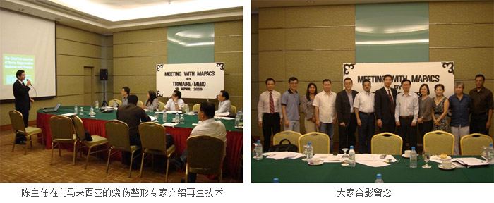 2009年4月18日,馬來(lái)西亞2009年燒傷整形外科常務(wù)委員會(huì)議在吉隆坡Boulevard Hotel召開(kāi),參加會(huì)議的有來(lái)自各州、省、市的重要的燒傷、整形專(zhuān)家約15人。陳永翀主任應(yīng)邀參加會(huì)議,并以“The chief introduction of burns regenerative medicine and therapy”為題進(jìn)行專(zhuān)題報(bào)告,在陳主任的30分鐘的演講中,向各位燒傷整形專(zhuān)家闡述了全厚皮燒傷通過(guò)激活潛能再生細(xì)胞轉(zhuǎn)化為干細(xì)胞,然后利用干細(xì)胞培養(yǎng)再生技術(shù)實(shí)現(xiàn)原位再生復(fù)原皮膚器官的過(guò)程,同時(shí)向大家展示了眾多的大面積特重度燒傷的臨床病例,大家聽(tīng)后非常興奮和激動(dòng),各位專(zhuān)家爭(zhēng)先恐后地舉手提問(wèn),陳主任和助手們則逐一進(jìn)行解答,大家還紛紛詢(xún)問(wèn)何時(shí)能夠買(mǎi)到MEBO和引進(jìn)該技術(shù),提問(wèn)和討論階段占了1個(gè)半小時(shí)。最后,燒傷學(xué)會(huì)主席Dr. Peter Wong向陳永翀主任發(fā)出邀請(qǐng),邀請(qǐng)陳主任出席2010由馬來(lái)西亞燒傷學(xué)會(huì)主辦的在馬來(lái)西亞Kuching市召開(kāi)的亞洲燒傷整形大會(huì)并做專(zhuān)題演講。
