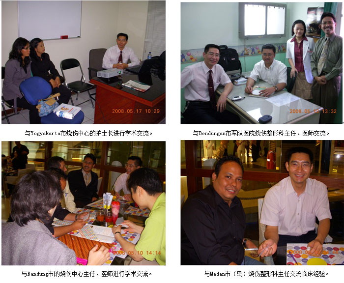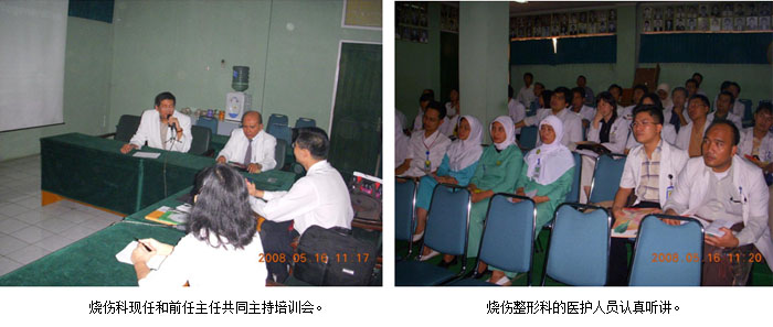 五、2008年5月16日,在印尼第二大城市Surabaya市,到該市最大的醫(yī)科大學(xué)附屬教學(xué)醫(yī)院Hasan Sadikin Hospital/Univ. of Padjadjaran 對(duì)燒傷整形科醫(yī)護(hù)人員進(jìn)行培訓(xùn),該院也是一所公立醫(yī)科大學(xué)教學(xué)醫(yī)院,醫(yī)院病床約1100張,開設(shè)內(nèi)、外、婦、兒等臨床科室30多個(gè),其中心血管科、呼吸科、骨科、燒傷整形外科和重癥監(jiān)護(hù)科是重點(diǎn)學(xué)科。培訓(xùn)會(huì)由燒傷整形外科現(xiàn)任主任Dr. Hardisiswo Soedjana 和前任主任Dr. Achmad Koswara主持,參加人員有燒傷整形外科的醫(yī)護(hù)人員約35人。醫(yī)院燒傷科在2005年開始在臨床上應(yīng)用燒傷皮膚再生技術(shù)治療燒傷病人,曾救治成功TBSA=40%燒傷病人,通過(guò)這次的培訓(xùn),將有效提高他們的臨床技術(shù)和增強(qiáng)應(yīng)用燒傷皮膚再生技術(shù)救治大面積特重度燒傷病人的信心。
