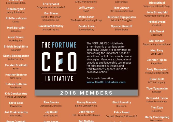 《財富》CEO倡議是《財富》雜志在2017年成立的組織,從財富500強中挑選出104位CEO商討商業(yè)組織如何通過共同合作在創(chuàng)造財富的同時使世界變得更好。這也是響應(yīng)2016年教皇方濟各對財富500強的期望-其中的精英CEO、學(xué)者和慈善家們能夠合作為世界貧困問題提供解決策略來促進世界繁榮。