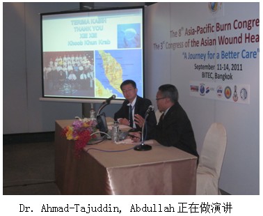 在演講后的問答環(huán)節(jié)中,與會醫(yī)生提出在再生醫(yī)學治療過程中創(chuàng)面清理問題,Dr. Ahmad-Tajuddin, Abdullah著重提到再生醫(yī)學治療過程中,創(chuàng)面清理應該遵循的三個及時以及三不原則,由此才可以取得良好的療效。敘利亞專家就供皮區(qū)的治療時間為2個月提出疑問,因為他們的經(jīng)驗,使用美寶再生技術(shù),3-4周甚至更短的時間就會再生愈合得很好,Dr. Ahmad-Tajuddin, Abdullah解釋說,在其介紹的病例中,供皮區(qū)取得“過深”,導致了一個類似于三度的創(chuàng)面,才是治療時間延長。