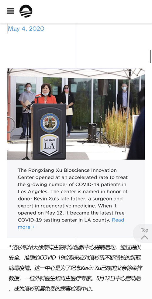 新冠肺炎疫情期間,洛杉磯州大徐榮祥生物科學創(chuàng)新中心設立為了新冠肺炎免費檢測點。奧巴馬基金會將這一充滿溫情的信息與系列或感人或激勵的暖心小故事一起登于官網(wǎng),在艱難時刻傳遞希望與愛。