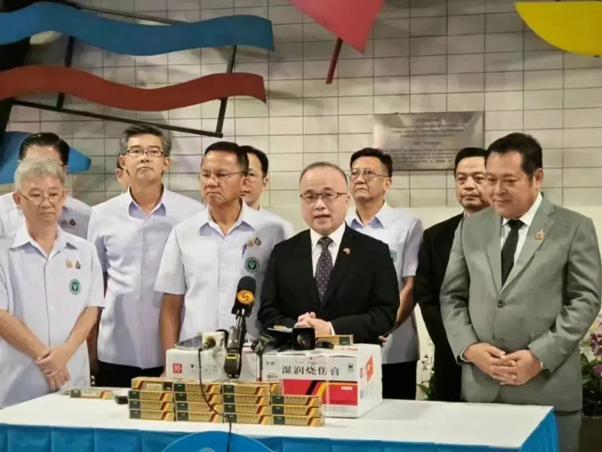 10月2日下午,受中國駐泰國大使韓志強的委托,公使吳志武在廊曼國際機場舉行了美寶濕潤燒傷藥膏的交接儀式。泰國衛(wèi)生部長頌薩、司法部長塔威親臨現(xiàn)場,共同見證了這一時刻,并向中方表達(dá)了深深的感激之情。