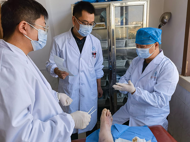 2024年11月27日,《中國燒傷創(chuàng)瘍雜志》編委、燒傷創(chuàng)瘍再生醫(yī)療技術臨床專家金黨軍,應邀到訪湖南省婁底市新化縣中醫(yī)醫(yī)院外三科,會診了兩例高齡糖尿病足患者、一例壓瘡患者。金黨軍教授仔細查看創(chuàng)面,對現(xiàn)殘存在創(chuàng)面的壞死組織即刻進行清理,并指導醫(yī)師使用再生醫(yī)療技術規(guī)范換藥,同醫(yī)師們講解了該技術臨床應用及注意事項。對于患者飲食營養(yǎng),金黨軍教授向家屬提供了可行性方案。鄒文新主任對專家的到來表示由衷的感謝,并表示下一步科室會逐步規(guī)范推廣應用再生醫(yī)療技術聯(lián)合VSD負壓吸引治療創(chuàng)面,歡迎專家多來臨床指導引導,為患者更好地服務!