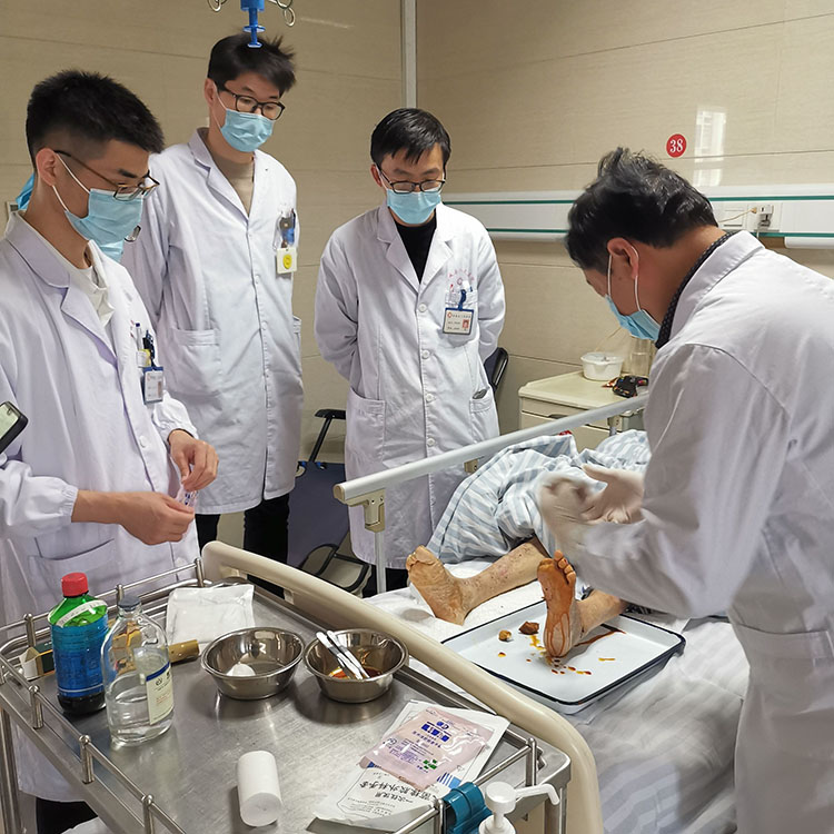 3月27日,應(yīng)河北省張家口市中醫(yī)院邀請,再生醫(yī)學(xué)知名專家、《中國燒傷創(chuàng)瘍雜志》常務(wù)編委趙瑞慶主任,來到該院會診了四例創(chuàng)面患者,對糖尿病足潰瘍、右足感染性潰瘍,伴骨髓炎、下肢靜脈性潰瘍、足底感染竇道等慢性難愈合創(chuàng)面親自指導(dǎo)換藥,并進行了規(guī)范化示范操作。同時給科室醫(yī)護人員進行了以再生醫(yī)療技術(shù)為主治療難愈合創(chuàng)面的學(xué)術(shù)講座,得到了患者及科室人員的高度贊揚和感謝!