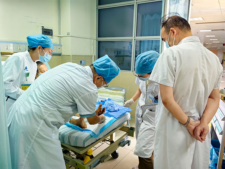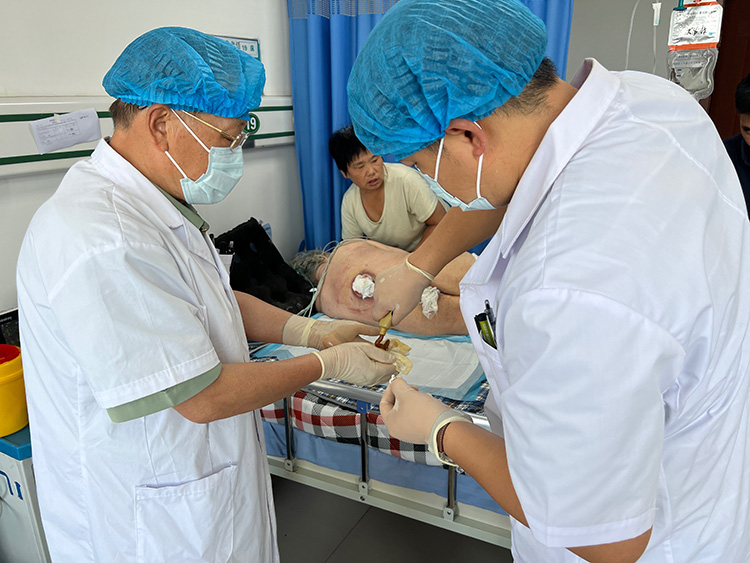 2025年7月12日,中國中西醫(yī)結(jié)合學(xué)會燒傷專業(yè)委員會常務(wù)委員、《中國燒傷創(chuàng)瘍雜志》副總編輯王洪生,受邀到漳州市龍海區(qū)榜山衛(wèi)生院會診一例糖尿病足患者,王教授現(xiàn)場教學(xué),親自示范清創(chuàng)和換藥,得到了醫(yī)護人員和患者家屬的一致好評!