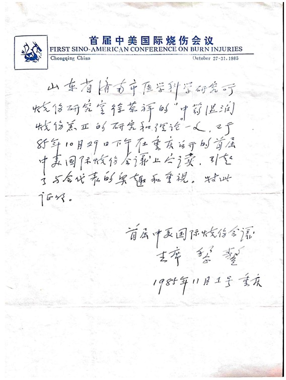 3、1985年10月,發(fā)明人出席重慶首屆中美國際燒傷會議,發(fā)表了濕潤燒傷膏的研究論文,盛志勇主持會議,引起與會者重視,大會主席黎鰲教授寫出證明信函,望山東省支持徐榮祥的燒傷研究,隨之濟南市衛(wèi)生局誹謗是假信。(原件一直保留,只給他們看,沒交給他們,以下是原件)從此矛盾激化。衛(wèi)生局黨委發(fā)出最后通知,1986年8月31日,在局黨委書記辦公室寫了辭職報告(1986年9月1日,國家發(fā)布科技人員可辭職的文件生效日)。