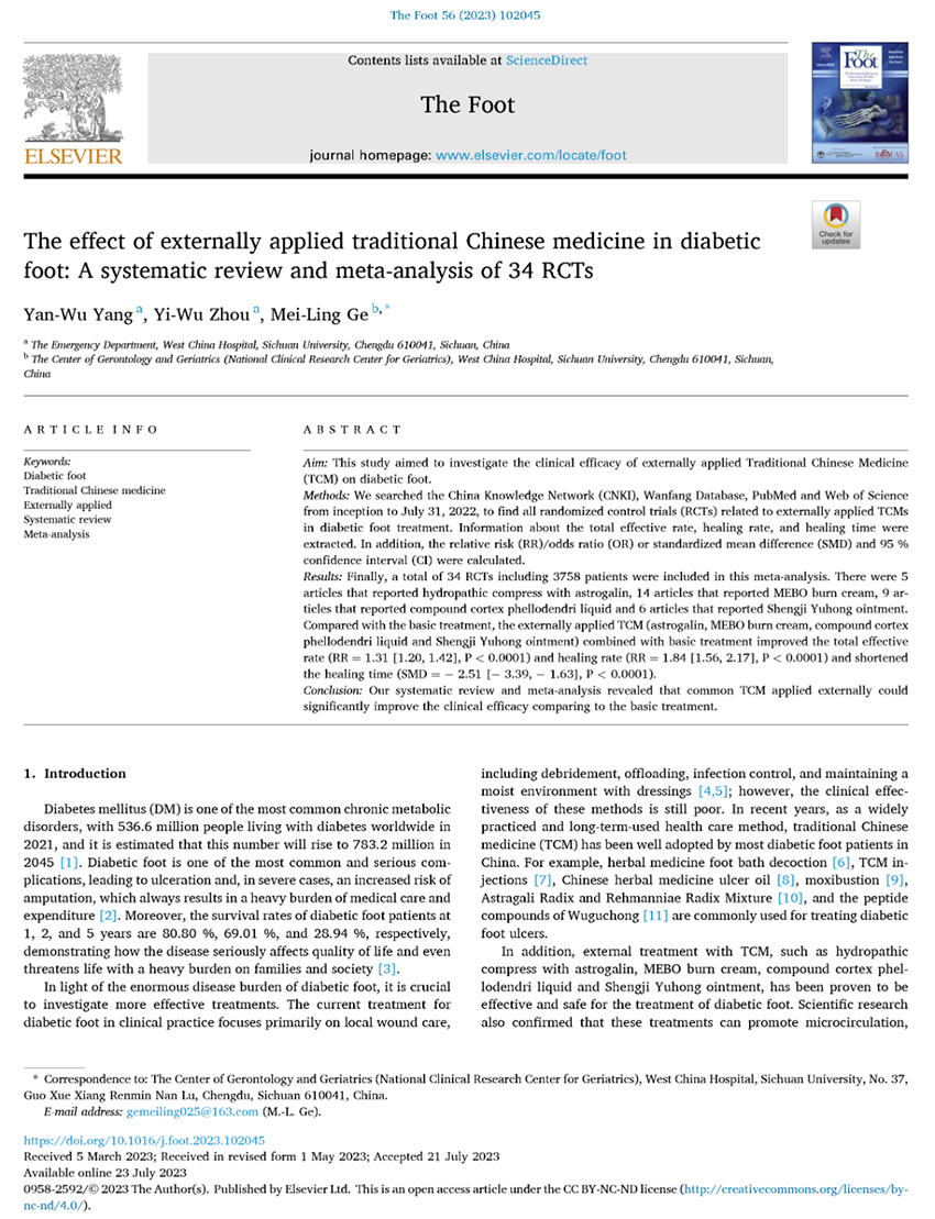 MEBO等中藥開啟糖尿病足治療新篇章:《外用中藥對糖尿病足的治療效果:34項隨機對照試驗的系統(tǒng)評價與薈萃分析》