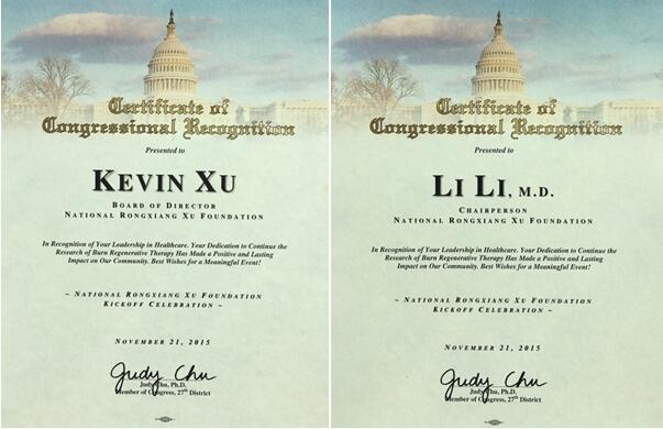 美國(guó)國(guó)會(huì)議員及洛杉磯教委委員對(duì)徐榮祥基金會(huì)的成立表示祝賀,并頒發(fā)證書。國(guó)會(huì)議員趙美心表示,目前美國(guó)正面臨醫(yī)生資源短缺、政府在醫(yī)學(xué)領(lǐng)域投資縮減的局面,并且在某些新技術(shù)與發(fā)明上已經(jīng)滯后,而在基金會(huì)贊助下成立的研究中心將有利于扭轉(zhuǎn)這一局面,在損傷器官領(lǐng)域作出突破性貢獻(xiàn)。趙美心認(rèn)為,徐榮祥基金會(huì)的成立不僅僅是為了向徐大夫致敬,更代表著一個(gè)可以令人類世世代代更健康的契機(jī)。