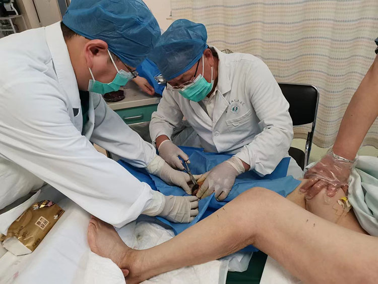2023年6月13日,再生醫(yī)學(xué)知名專家、《中國(guó)燒傷創(chuàng)瘍雜志》常務(wù)編委趙瑞慶主任,應(yīng)邀到蘇州市第九人民醫(yī)院急診ICU會(huì)診褥瘡患者,為患者探察腔隙、清創(chuàng)、規(guī)范換藥,邊操作邊講解注意事項(xiàng),并對(duì)下一步的治療提出建議,得到急診外科金冬林主任及醫(yī)務(wù)人員真誠(chéng)的感謝。隨后趙教授不辭辛苦,到吳江區(qū)中醫(yī)院深入科室傳經(jīng)送寶,給急診外科做再生醫(yī)療技術(shù)治療糖尿病足的專題講座,受到安主任及醫(yī)務(wù)人員的一致好評(píng)。