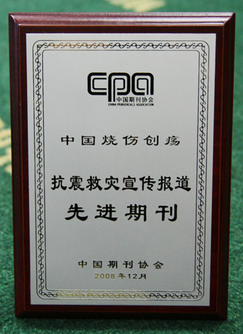 中國期刊協(xié)會為了表彰先進(jìn),于今年8月在全國期刊界開展了評選抗震救災(zāi)宣傳報道先進(jìn)期刊及先進(jìn)個人的活動,在經(jīng)過中宣部出版局、民政部、新聞出版總署有關(guān)部門的領(lǐng)導(dǎo)和業(yè)界專家組成的評審委員會進(jìn)行認(rèn)真評審后,決定授予106種期刊“全國抗震救災(zāi)宣傳報道先進(jìn)期刊”的榮譽(yù)稱號,《中國燒傷創(chuàng)瘍雜志》在全國九千多種期刊中涌現(xiàn)了出來,獲此殊榮。