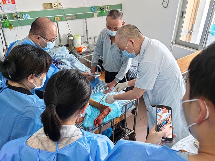 2023年7月4日,重慶長壽區(qū)中醫(yī)院一例老年患者因艾灸治療不慎被燙傷,應(yīng)科室陳主任邀請,享受國務(wù)院特殊津貼專家、中國中西醫(yī)結(jié)合燒傷專業(yè)委員會顧問、中國研究型醫(yī)院學(xué)會創(chuàng)面防治與損傷組織修復(fù)專業(yè)委員會委員、《中國燒傷創(chuàng)瘍雜志》常務(wù)編委、成都市郫都區(qū)人民醫(yī)院燒傷創(chuàng)瘍科學(xué)術(shù)帶頭人付子俊教授,前往醫(yī)院會診,付教授問詢了患者受傷的情況,跟科室醫(yī)護(hù)人員一起交流了再生醫(yī)療技術(shù)臨床換藥的要點,然后到病房親自換藥指導(dǎo)如何清除壞死組織,換藥后進(jìn)行了臨床交流。