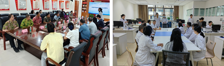 8月27日,訪問團(tuán)再次前往燒傷創(chuàng)瘍科病房,在王鄉(xiāng)寧主任的帶領(lǐng)下對患者進(jìn)行查房。通過床旁講解,訪問團(tuán)了解到了進(jìn)行多技術(shù)聯(lián)合治療的最佳時機(jī)以及輔助治療對促進(jìn)創(chuàng)面愈合的良好效果。病房參觀結(jié)束后,雙方醫(yī)生圍坐學(xué)習(xí)室,來自RSUD Dr. Soetomo醫(yī)院整形外科的Agus Santoso Budi主任及來自RSUP Dr. Sardjito醫(yī)院整形外科的Rianto Noviady Ramli主任分享了在印尼當(dāng)?shù)貞?yīng)用再生醫(yī)療技術(shù)治療燒傷的經(jīng)驗,通過與中方專家的交流,代表團(tuán)更加深入的了解到了如何在臨床中正確應(yīng)用該技術(shù)的治療原則。
