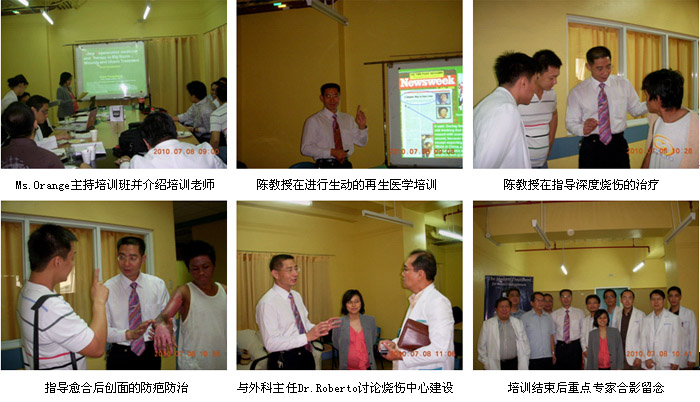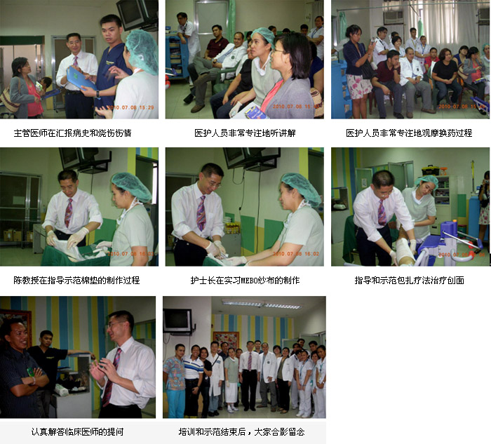 2010年7月7日首家再生醫(yī)學(xué)燒傷創(chuàng)瘍治療中心在菲律賓首都馬尼拉正式掛牌成立后,來(lái)自中國(guó)北京MEBO燒傷創(chuàng)瘍研究所國(guó)際部的徐沖與菲律賓方面負(fù)責(zé)再生醫(yī)學(xué)技術(shù)推廣的Ms.Orange進(jìn)行了認(rèn)真的討論、組織和策劃,在接下來(lái)的5天時(shí)間里,成功展開(kāi)了一系列的、方式靈活的醫(yī)療開(kāi)發(fā)和維護(hù)工作。期間,中國(guó)燒傷創(chuàng)瘍科技中心臨床部主任、北京榮祥再生醫(yī)學(xué)研究所副所長(zhǎng)、北京中西醫(yī)結(jié)合學(xué)會(huì)燒傷專(zhuān)業(yè)委員會(huì)副主任委員陳永翀教授,先后應(yīng)邀到4家政府醫(yī)院,進(jìn)行燒傷再生醫(yī)學(xué)技術(shù)培訓(xùn)、學(xué)術(shù)交流,以及到燒傷中心會(huì)診指導(dǎo)大面積燒傷病例的治療,受到醫(yī)院、醫(yī)師、護(hù)士和患者的歡迎。在短短的5天時(shí)間里,舉辦了院級(jí)培訓(xùn)班3期,燒傷中心內(nèi)部培訓(xùn)2期,重點(diǎn)專(zhuān)家學(xué)術(shù)交流3次,培訓(xùn)了燒傷、整形、普通外科、骨科的醫(yī)師和護(hù)士59名,對(duì) 2家重點(diǎn)老醫(yī)院進(jìn)行了有效的維護(hù)和促進(jìn),成功新開(kāi)發(fā)了2家政府教學(xué)醫(yī)院,會(huì)診、指導(dǎo)特重度燒傷1例,重度燒傷2例,疤痕1例,實(shí)現(xiàn)了較好的醫(yī)療開(kāi)發(fā)、維護(hù)和進(jìn)一步規(guī)范臨床技術(shù)的效果。