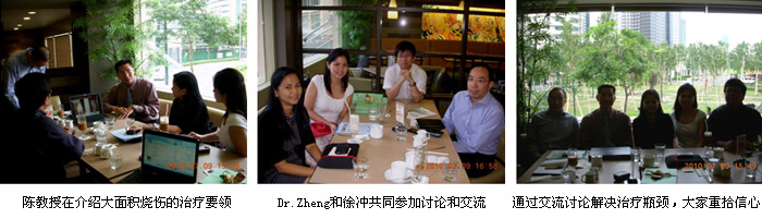 5、7月9日下午3點(diǎn),陳教授再次與PGH(菲律賓總醫(yī)院,菲律賓最大醫(yī)院,2007年引進(jìn)燒傷再生醫(yī)學(xué)技術(shù))的燒傷中心主任、菲律賓燒傷學(xué)會(huì)主席Dr. Glenn Angelo和骨干專(zhuān)家進(jìn)行了深度的學(xué)術(shù)交流。在交流中,陳教授重點(diǎn)講解了大面積特重度燒傷患者的全身系統(tǒng)治療方法和要領(lǐng),尤其是燒傷再生醫(yī)學(xué)與療法與傳統(tǒng)外科干燥植皮技術(shù)在全身系統(tǒng)治療的最大區(qū)別之處。如:大面積燒傷休克期的補(bǔ)液量的計(jì)算和補(bǔ)液的原則;在內(nèi)臟器官功能的保護(hù)和恢復(fù)方面突出強(qiáng)心、保腎的緊急性和重要性等。為該燒傷中心下階段采用再生醫(yī)學(xué)技術(shù)實(shí)現(xiàn)80%~90%燒傷患者的成功救治做好準(zhǔn)備。另外,陳教授還向大家介紹了新產(chǎn)品MEBO創(chuàng)瘍貼和疤痕平的臨床效果和使用方法。通過(guò)這次的深度交流、討論,大家都覺(jué)得受益匪淺,而且也找到了原來(lái)治療大面積燒傷病人失敗的主要原因,增強(qiáng)了大家繼續(xù)采用再生醫(yī)學(xué)技術(shù)治療大面積燒傷的信心。