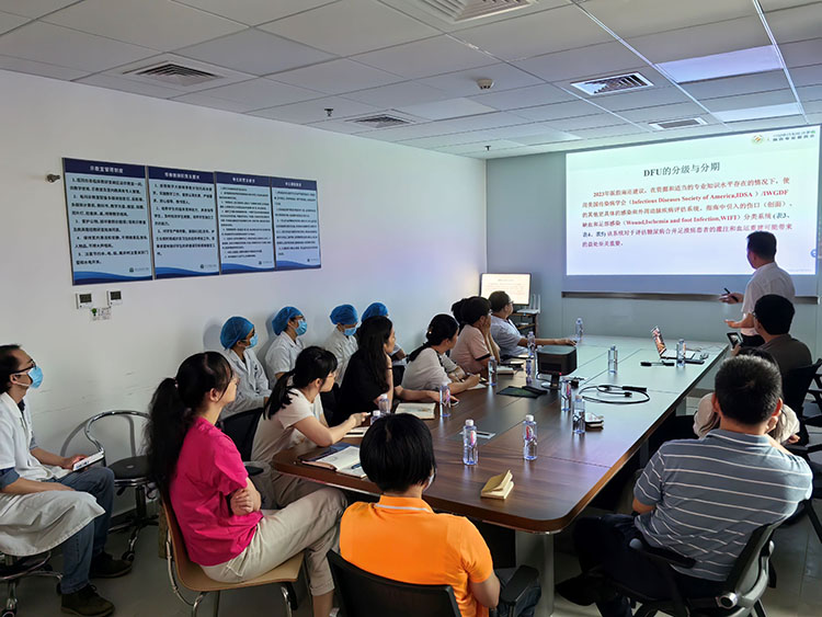 2024年5月24日,應(yīng)廣州市番禺區(qū)中醫(yī)院創(chuàng)面修復(fù)科李敬礦主任邀請(qǐng),中國(guó)中西醫(yī)結(jié)合學(xué)會(huì)燒傷專業(yè)委員會(huì)常務(wù)委員、《中國(guó)燒傷創(chuàng)瘍雜志》副總編輯王洪生,到科室查房會(huì)診糖尿病足、壓瘡等創(chuàng)面病人。王教授親自示范指導(dǎo)清創(chuàng)換藥,并就創(chuàng)面處理過(guò)程中的要點(diǎn)進(jìn)行詳細(xì)講解,受到醫(yī)患人員的一致好評(píng),隨后進(jìn)行學(xué)術(shù)交流。參加此次學(xué)術(shù)交流的有番禺區(qū)中醫(yī)院、番禺區(qū)中心醫(yī)院、番禺區(qū)第二人民醫(yī)院、番禺區(qū)康復(fù)醫(yī)院、番禺區(qū)化龍醫(yī)院、番禺區(qū)鐘村社區(qū)中心、番禺區(qū)南村社區(qū)中心、番禺區(qū)沙灣社區(qū)中心、番禺區(qū)東環(huán)街道社區(qū)中心等番禺區(qū)創(chuàng)面修復(fù)聯(lián)盟單位從事創(chuàng)面修復(fù)的醫(yī)護(hù)老師。王教授以《糖尿病足潰瘍?cè)\療進(jìn)展及規(guī)范化處理要點(diǎn)》為題進(jìn)行學(xué)術(shù)交流,以大量臨床病例結(jié)合手術(shù)操作視頻分享再生醫(yī)療技術(shù)和微粒皮種植術(shù)等在相關(guān)慢性創(chuàng)面的應(yīng)用及取得良好效果,受到與會(huì)人員的一致好評(píng)。燒傷創(chuàng)瘍?cè)偕t(yī)療技術(shù)的推廣,不僅弘揚(yáng)中國(guó)中醫(yī)藥傳統(tǒng)文化,而且提高了臨床醫(yī)生的救治水平,解決臨床復(fù)雜的難愈合創(chuàng)面治療問(wèn)題,可以提高患者的生存質(zhì)量,減輕社會(huì)及家庭的經(jīng)濟(jì)負(fù)擔(dān)。