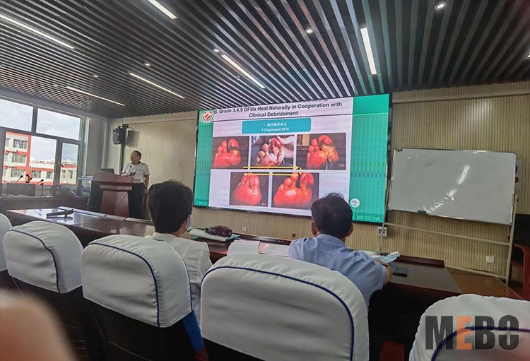 2022年9月6日,中國中西醫(yī)結(jié)合學(xué)會燒傷專業(yè)委員會醫(yī)療部張強(qiáng)主任應(yīng)邀到訪湖北宜昌宜都市中醫(yī)醫(yī)院骨外科,在科室張禹副主任主持下,進(jìn)行了《難治性創(chuàng)瘍的治療》講座,講解條理清晰,通過各類治療病例的展示,使理論深入淺出。醫(yī)師們表示受益頗多,并更加了解了再生醫(yī)療技術(shù)的發(fā)展前沿??剖医涣鹘Y(jié)束后,張主任會診一例骨折后皮膚缺損骨外露患者。張主任建議患者創(chuàng)面應(yīng)用美寶再生醫(yī)療技術(shù)換藥,不僅生肌止痛,而且愈合效果理想,并為大家示范了規(guī)范換藥流程。