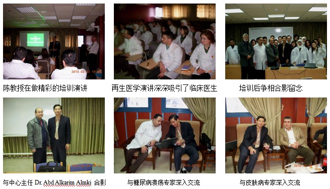 三、2010年2月3日中午,陳教授應(yīng)邀到衛(wèi)生部Damascus Dermatology Medical Center(衛(wèi)生部大馬士革皮膚病醫(yī)療中心),對該中心的皮膚科、糖尿病潰瘍科和皮膚創(chuàng)傷科的30多名醫(yī)師進(jìn)行了再生醫(yī)學(xué)技術(shù)培訓(xùn),該中心的主任Dr. Abd Alkarim Almki 主持了培訓(xùn)會議,陳教授以“再生醫(yī)學(xué)技術(shù)促進(jìn)皮膚損傷愈合的機(jī)理與臨床應(yīng)用”為題,介紹了再生醫(yī)學(xué)在皮膚科和創(chuàng)瘍領(lǐng)域的臨床應(yīng)用經(jīng)驗(yàn),大家學(xué)得非常認(rèn)真,覺得這次的培訓(xùn)為他們治療各種皮膚疾病找到了更有效的方法。再生醫(yī)學(xué)培訓(xùn)在該院引起了很大的轟動(dòng)和反響,掀起了大家學(xué)習(xí)、應(yīng)用再生醫(yī)學(xué)技術(shù)的熱情和積極性。