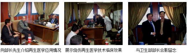 四、2010年2月3日下午,在衛(wèi)生部附屬皮膚病醫(yī)療中心主任Dr. Abd Alkarim Almki的推薦和聯(lián)系下,陳教授一行約見了敘利亞衛(wèi)生部部長Dr. Reda Saed。在會見期間,陳教授向衛(wèi)生部部長介紹了燒傷再生醫(yī)學(xué)技術(shù)的先進(jìn)性、實(shí)用性和該技術(shù)在中國和其它國家的臨床應(yīng)用情況以及取得的良好的臨床治療效果。部長對燒傷再生醫(yī)學(xué)技術(shù)非常感興趣,希望以后有機(jī)會到中國進(jìn)行實(shí)地參觀、考察。這次能夠約見敘利亞衛(wèi)生部部長,為燒傷再生醫(yī)學(xué)技術(shù)在敘利亞的學(xué)術(shù)、技術(shù)全面推廣爭取政府的支持和幫助做好了準(zhǔn)備。