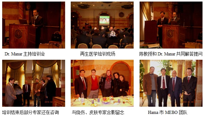 九、2010年2月8日下午2時(shí),Hama市再生醫(yī)學(xué)技術(shù)臨床應(yīng)用培訓(xùn)班在Cham Palace Hotel成功舉辦。來自全市各醫(yī)院和診所的燒傷、整形、普外、骨科、婦產(chǎn)科、皮膚科的35名臨床專家和5名藥劑師參加了“燒傷再生醫(yī)學(xué)技術(shù)在燒傷、創(chuàng)傷與潰瘍的”專題演講會,反響熱烈,培訓(xùn)效果較好。