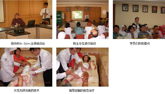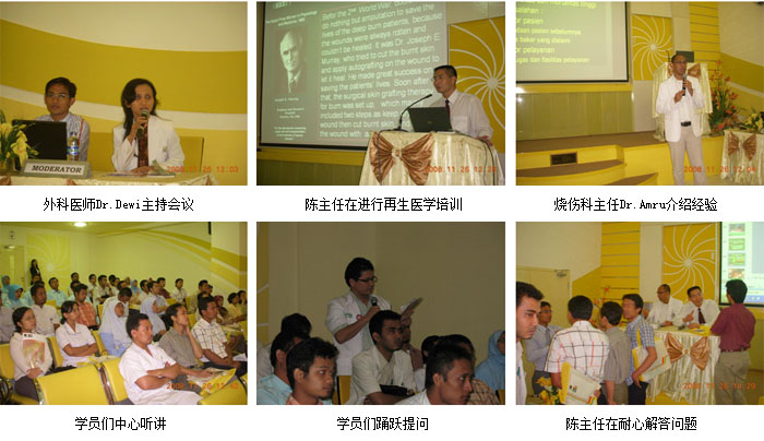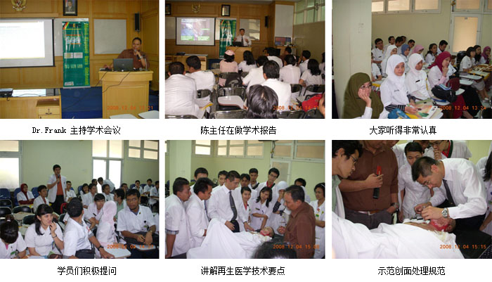 十、2008年12月2日上午,我們到Tangerang City的Tangerang Hospital舉辦培訓(xùn)班,來自全市5家主要醫(yī)院的50多名外科和全科醫(yī)師接受了再生醫(yī)學(xué)技術(shù)的臨床知識培訓(xùn),并解答大家在臨床應(yīng)用中遇到的問題。下午,到該院會診指導(dǎo)燒傷創(chuàng)面的規(guī)范處理技術(shù)。