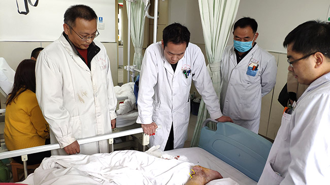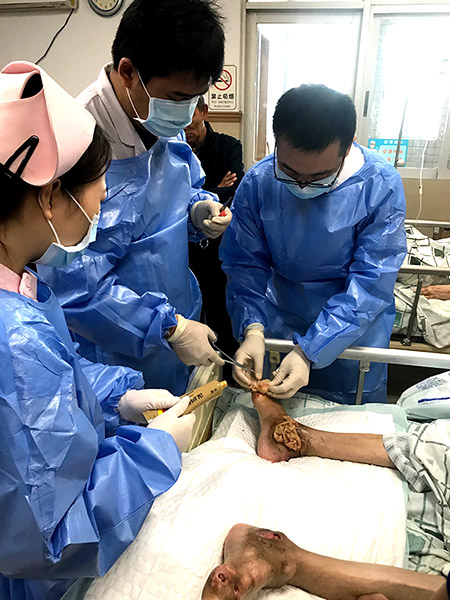3月8日上午,北京榮祥再生醫(yī)學(xué)研究所副所長(zhǎng)、中國(guó)中西醫(yī)結(jié)合學(xué)會(huì)燒傷專業(yè)委員會(huì)常務(wù)委員、《燒傷創(chuàng)瘍雜志》副總編輯、應(yīng)用燒傷創(chuàng)瘍?cè)偕t(yī)療技術(shù)治療糖尿病足領(lǐng)域?qū)<摇⒀芯繂T王洪生主任應(yīng)邀到南方醫(yī)科大學(xué)附屬南海醫(yī)院燒傷整形科會(huì)診一例重度雙下肢痛風(fēng)潰瘍患者,并對(duì)年輕醫(yī)生進(jìn)行臨床教學(xué)示范。