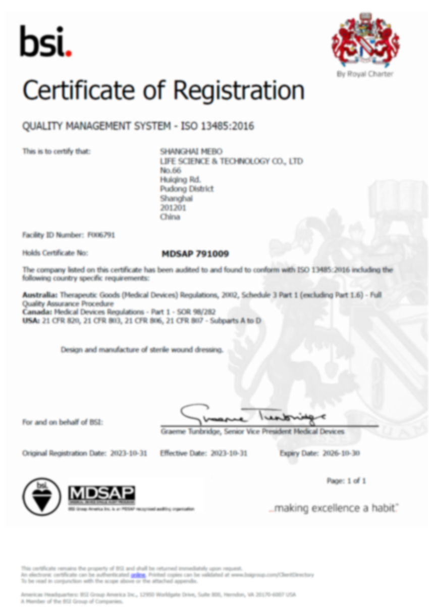 近日,上海美寶生命科技有限公司榮獲由國(guó)際權(quán)威公告機(jī)構(gòu)BSI所頒發(fā)的MDSAP認(rèn)證。認(rèn)證范圍包括了無(wú)菌創(chuàng)面敷料的研發(fā)設(shè)計(jì)與生產(chǎn)。該項(xiàng)認(rèn)證的獲得進(jìn)一步提升了美寶產(chǎn)品競(jìng)爭(zhēng)力,加強(qiáng)了國(guó)際市場(chǎng)運(yùn)作能力,提高了質(zhì)量管理與風(fēng)險(xiǎn)控制的要求。
