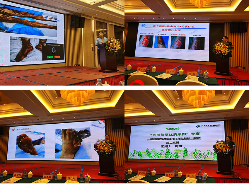 第二屆“榮祥杯”病例大賽一等獎(jiǎng)獲得人員分別作了參賽病例的匯報(bào),為各基層醫(yī)護(hù)人員規(guī)范使用再生醫(yī)療技術(shù)的努力和發(fā)展提供了方向和標(biāo)桿。婁底市第一人民醫(yī)院周勇以《再生醫(yī)療技術(shù)在特重度燙傷100%TBSA 患者中的應(yīng)用》為主題;瀏陽市人民醫(yī)院焦獻(xiàn)功以《美寶濕潤燒傷膏治療特大面積燒傷創(chuàng)面》為核心;湖南省人民醫(yī)院姚夢(mèng)枝以《為糖尿病患者保駕護(hù)航--多學(xué)科診療合作(MDT)》為方向;湘南學(xué)院附屬醫(yī)院周琪以《一糖尿病性足病合并壞死性筋膜炎保肢成功案例》、中南大學(xué)湘雅三醫(yī)院胡蛟以《一例壓力性損傷合并截癱患者的創(chuàng)面修復(fù)案例 》做了現(xiàn)場病例展示。