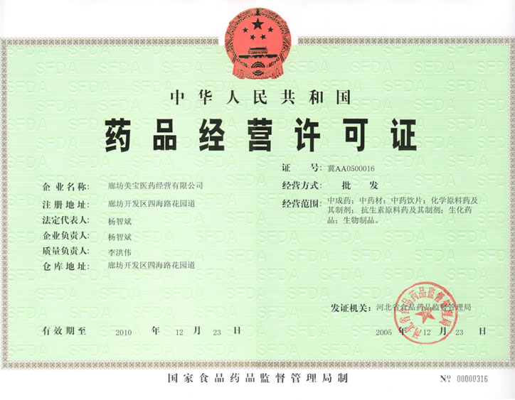 廊坊美寶醫(yī)藥經(jīng)營有限公司在基地全體員工的共同努力下,在集團(tuán)董事局的關(guān)懷和指導(dǎo)下,于2005年12月13日順利通過了藥品監(jiān)督管理局的藥品經(jīng)營許可證的驗(yàn)收檢查。并于2005年12月31日取得藥品經(jīng)營許可證。這標(biāo)志著廊坊美寶基地按照美寶國際集國的總體規(guī)劃,向GSP經(jīng)營方向邁出了成功的第一步。