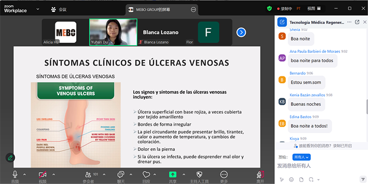 在專題研討環(huán)節(jié),美寶國際技術(shù)部講師杜鈺涵進(jìn)行了深度學(xué)術(shù)分享,從流行病學(xué)特征、病理生理機(jī)制、國際診斷標(biāo)準(zhǔn)到再生醫(yī)療技術(shù)的作用機(jī)理與臨床適應(yīng)癥,全方位構(gòu)建了靜脈潰瘍的防治知識體系。特別針對聯(lián)合治療方案優(yōu)化、典型病例分析及長期預(yù)防策略等臨床痛點(diǎn),提供了基于循證醫(yī)學(xué)的解決方案。參會人員有來自巴西、秘魯、哥斯達(dá)黎加等不同拉美國家的醫(yī)生和學(xué)者們多達(dá)130人,大家在會議期間踴躍提問,諸如在應(yīng)用再生醫(yī)療技術(shù)期間對于傷口恢復(fù)的作用、慢性創(chuàng)面的病因與再生醫(yī)療技術(shù)的作用機(jī)制,慢性創(chuàng)面多病因分析與個(gè)體化治療策略等,提出的問題得到逐一解答,獲得與會者一致好評?,F(xiàn)場互動(dòng)熱烈,充分展現(xiàn)了再生醫(yī)療技術(shù)在慢性創(chuàng)面治療領(lǐng)域的突破性價(jià)值與國際認(rèn)可度。