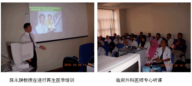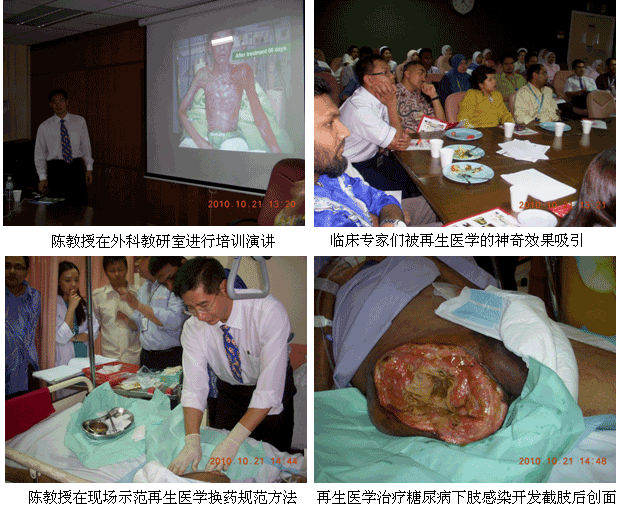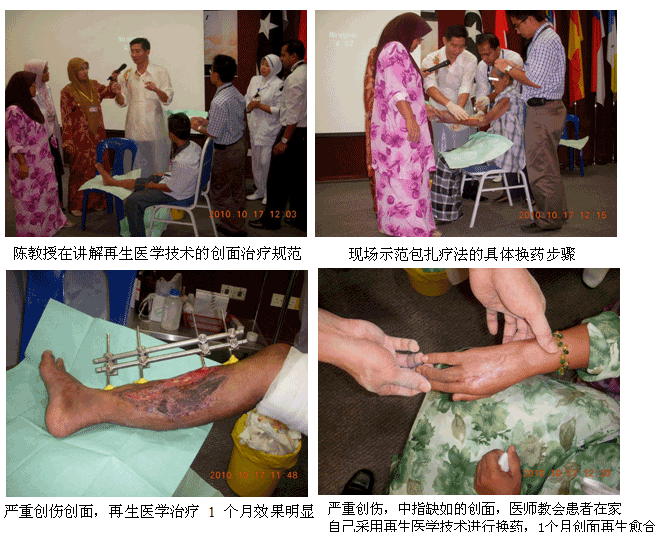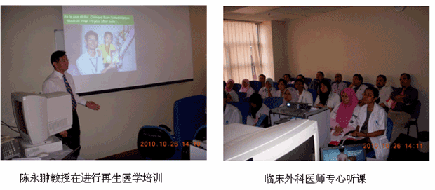 自從再生醫(yī)學(xué)學(xué)術(shù)演講在今年年7月在馬來西亞Kuching舉辦的亞太估計(jì)整形大會上引起轟動(dòng)和強(qiáng)烈反響后,再生醫(yī)學(xué)的學(xué)術(shù)地位和影響力在亞太地區(qū),特別是在馬來西亞得到了明顯提升。為了發(fā)揮出學(xué)術(shù)的優(yōu)勢,趁熱打鐵在馬來西亞推廣再生醫(yī)學(xué)技術(shù),2010年10月10日至29日,馬來西亞今年的第三輪醫(yī)療開發(fā)與維護(hù)工作順利展開,收效顯著。在20天的時(shí)間里,先后舉辦了州級(省級)培訓(xùn)班2期,院級培訓(xùn)班7期,培訓(xùn)了燒傷、整形、普通外科、骨科、內(nèi)科的醫(yī)師和護(hù)士580余名;對 5家老基地醫(yī)院的臨床應(yīng)用與技術(shù)規(guī)范進(jìn)行了有效的維護(hù)、推進(jìn)和提高;成功新開發(fā)了4家新的大型政府教學(xué)醫(yī)院和1家大學(xué)醫(yī)院;會診、指導(dǎo)30多例危重疑難病例的救治[燒傷7例(特重度燒傷2例),創(chuàng)傷13例,慢性潰瘍11例,皮膚病1例,等],醫(yī)療開發(fā)與維護(hù)齊頭并進(jìn)。