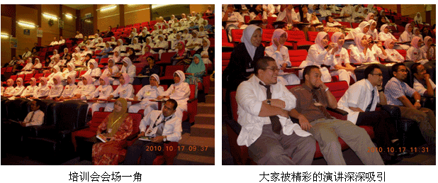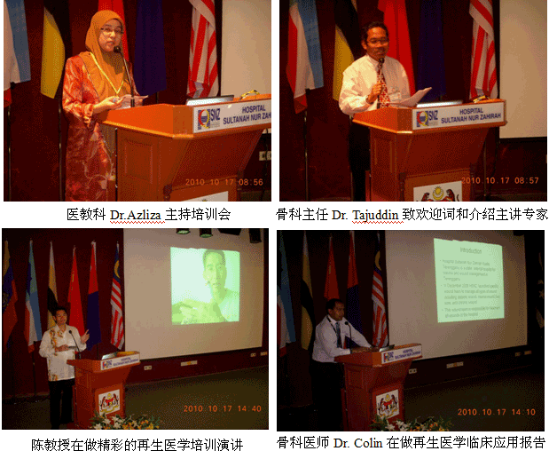 6、10月17日上午9時(shí),再生醫(yī)學(xué)州級培訓(xùn)班------Kuala Terenggganu State(夸拉. 登家樓州)醫(yī)學(xué)繼續(xù)教育項(xiàng)目在Hospital Sultanah Nur Zahirah (登家樓州中央醫(yī)院,1100病床)的禮堂勝利召開。來自全州各城市的10多家醫(yī)院的100多名醫(yī)護(hù)人員參加了培訓(xùn)會。培訓(xùn)會舉行了簡短的開幕儀式,該院醫(yī)教科的Dr. Azliza主持開幕式,創(chuàng)傷骨主任Dr. Ahmad Tajuddin致歡迎詞并向大家介紹主講專家。開幕儀式結(jié)束后,陳永翀教授應(yīng)邀以“燒傷再生醫(yī)學(xué)與療法在燒傷、創(chuàng)瘍的臨床規(guī)范應(yīng)用”為題,對前來參會的醫(yī)護(hù)人員進(jìn)行了較系統(tǒng)的再生醫(yī)學(xué)知識培訓(xùn),陳教授演講的內(nèi)容新穎、通俗易懂、有條理,很受大家的歡迎。接著,該院的骨科醫(yī)師Dr. Colin以“燒傷再生醫(yī)學(xué)技術(shù)在我院的臨床應(yīng)用報(bào)告”為題,向參會的臨床醫(yī)護(hù)人員介紹了骨科引進(jìn)和應(yīng)用再生醫(yī)學(xué)技術(shù)1年來所治療的37例創(chuàng)瘍患者所取得的神奇效果和體會,大家對這次的再生醫(yī)學(xué)專題培訓(xùn)會的培訓(xùn)內(nèi)容感到很滿意。