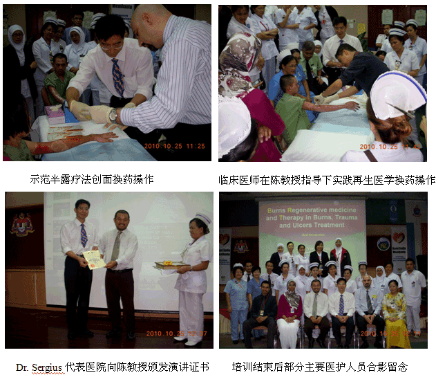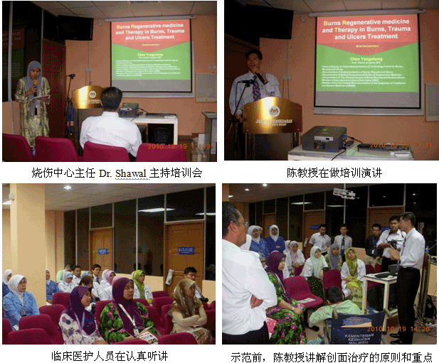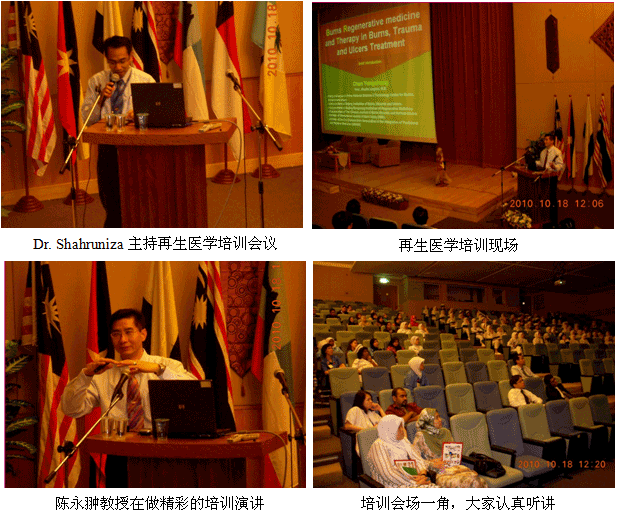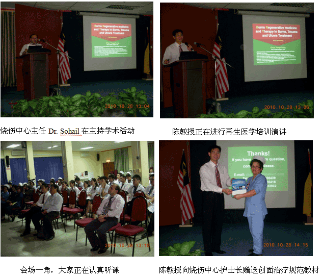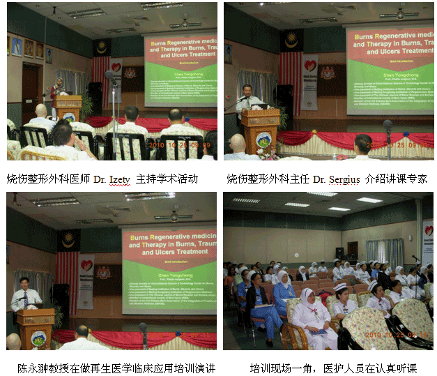 9、10月25日,再生醫(yī)學(xué)院級培訓(xùn)班在Hospital QEH (沙巴州中央醫(yī)院)學(xué)術(shù)報(bào)告廳舉辦,燒傷整形醫(yī)師Dr. Izety主持學(xué)術(shù)活動(dòng),燒傷整形中心主任Dr. Sergius介紹講課老師和談他參加國際會議認(rèn)識陳教授和了解到燒傷再生醫(yī)學(xué)的過程。來自該院的燒傷整形、普外、創(chuàng)傷骨科和急診科的60多名醫(yī)師、護(hù)士接受了再生醫(yī)學(xué)的培訓(xùn)。培訓(xùn)班還組織了2例燒傷病例的現(xiàn)場操作示范,通過現(xiàn)場示范,大家得以更全面和更直觀地學(xué)習(xí)和掌握再生醫(yī)學(xué)技術(shù)。培訓(xùn)結(jié)束后,該院馬上引進(jìn)和應(yīng)用燒傷再生醫(yī)學(xué)技術(shù)治療燒傷創(chuàng)瘍病人(目  前有1例37%的大面積特重度燒傷的患兒正在接受再生醫(yī)學(xué)治療)。