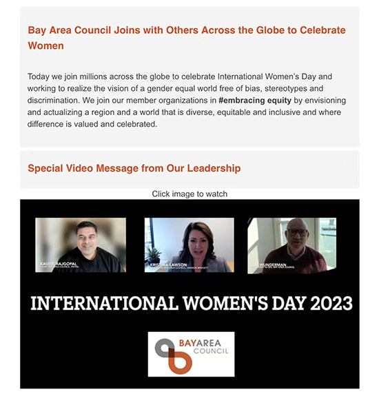 2023年3月8日,國際勞動婦女節(jié),舊金山灣區(qū)委員會(Bay Area Council)特意舉辦慶?;顒樱埰涑蓡T組織共同“擁抱公平”,接受并尊重差異,為實現(xiàn)一個沒有偏見、陳規(guī)成見和歧視的性別平等世界的愿景而努力,以期構建一個多元化、公平和包容的地區(qū)和世界。