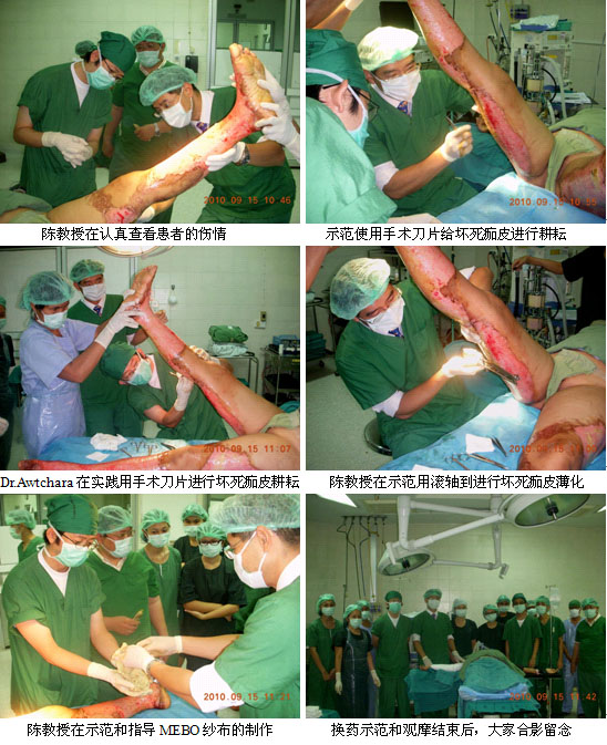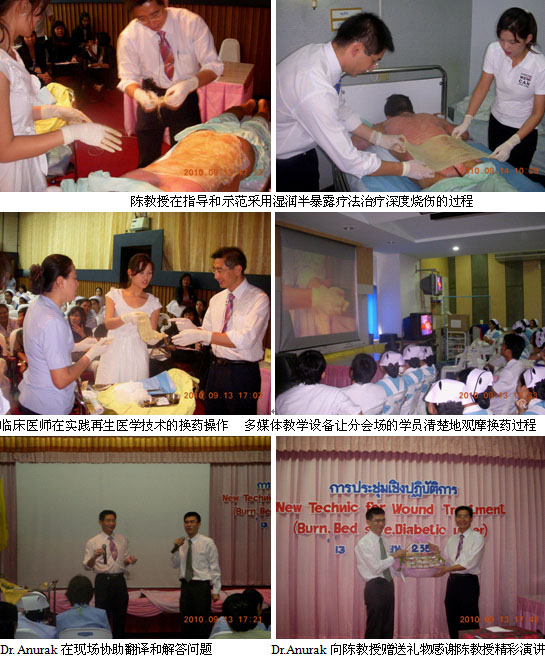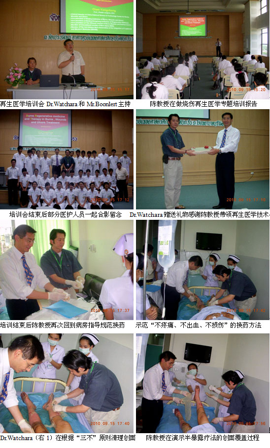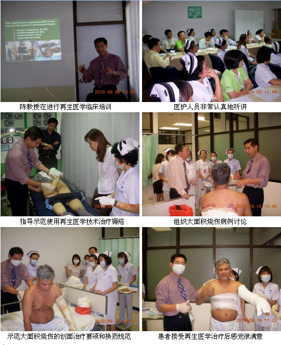 1、二次培訓(xùn)與臨床指導(dǎo)是對(duì)老醫(yī)院的有效維護(hù)與提高。9月6日、11日和16日,陳教授先后3次應(yīng)邀到曼谷市Klang Hospital 進(jìn)行培訓(xùn)和臨床指導(dǎo),30多名燒傷、整形和外科醫(yī)師、護(hù)士參加了培訓(xùn),多名燒傷創(chuàng)瘍患者在陳教授的指導(dǎo)下接受了再生醫(yī)學(xué)的治療,并取得了較好的臨床效果。