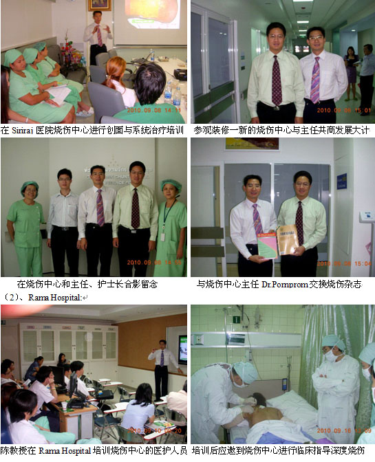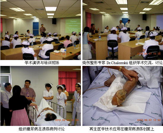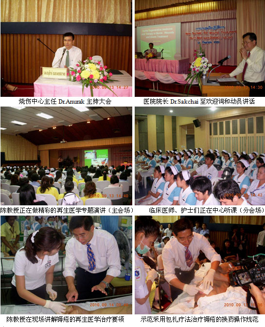 此次為了進(jìn)一步鞏固成果,加快再生醫(yī)學(xué)技術(shù)在泰國(guó)的臨床應(yīng)用,2010年9月5日至9月17日,經(jīng)過泰國(guó)市場(chǎng)區(qū)域經(jīng)理吳云及當(dāng)?shù)卮砩?、?jīng)銷商的精心的組織和策劃,中國(guó)燒傷創(chuàng)瘍科技中心臨床部主任、北京榮祥再生醫(yī)學(xué)研究所副所長(zhǎng)、北京中西醫(yī)結(jié)合學(xué)會(huì)燒傷專業(yè)委員會(huì)副主任委員、中國(guó)燒傷創(chuàng)瘍雜志社副社長(zhǎng)陳永翀教授應(yīng)邀到泰國(guó)10多家大型政府醫(yī)院及私人醫(yī)院進(jìn)行學(xué)術(shù)演講、技術(shù)培訓(xùn)和臨床指導(dǎo), 培訓(xùn)了泰國(guó)的醫(yī)護(hù)人員總計(jì)478人,會(huì)診指導(dǎo)和操作示范深度燒傷、慢性潰瘍、糖尿病潰瘍等病例共計(jì)17例,有效地鞏固并擴(kuò)大了燒傷再生醫(yī)學(xué)在泰國(guó)的學(xué)術(shù)地位,醫(yī)療開發(fā)工作取得了前所未有的突破,老基地掀起了學(xué)習(xí)應(yīng)用再生醫(yī)學(xué)技術(shù)的熱潮、呈現(xiàn)出勃勃生機(jī)。