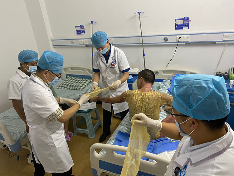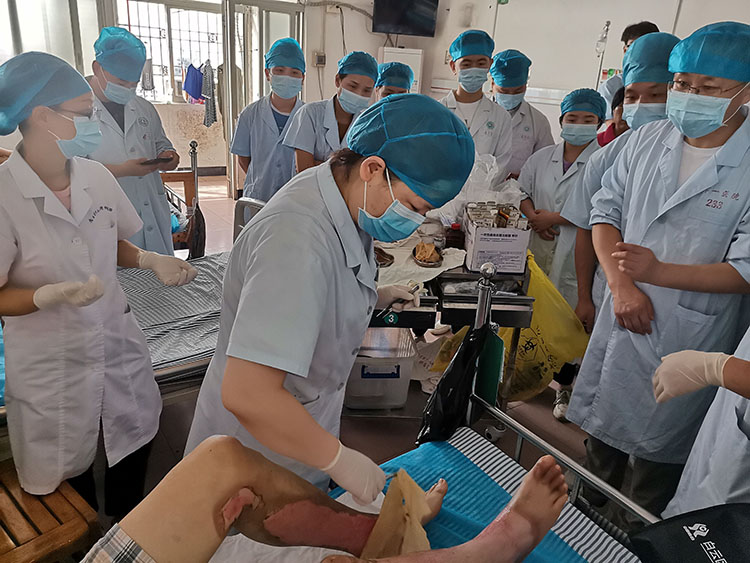 9月1日,北京榮祥再生醫(yī)學(xué)研究所副所長、中國中西醫(yī)結(jié)合學(xué)會燒傷專業(yè)委員會常務(wù)委員、《燒傷創(chuàng)瘍雜志》副總編輯、應(yīng)用燒傷創(chuàng)瘍再生醫(yī)療技術(shù)治療糖尿病足領(lǐng)域?qū)<?、研究員王洪生主任應(yīng)邀來到廣東省四會市慈航醫(yī)院、肇慶市仁愛手外科醫(yī)院分別會診兩例大燒傷面積病人。王教授親自到病房示范清創(chuàng)與換藥,進行臨床教學(xué),受到醫(yī)院領(lǐng)導(dǎo)及各醫(yī)護人員和患者家屬的高度贊揚認(rèn)可!