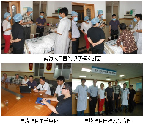5月22號上午王教授又驅(qū)車帶領(lǐng)新西蘭一行人來到了中山市黃埔人民醫(yī)院進(jìn)行參觀并受到了醫(yī)院領(lǐng)導(dǎo)以及皮膚美容科主任的熱烈歡迎。在皮膚科主任對醫(yī)院整體介紹后,一行人參觀了燒傷科病房,過程中王教授又針對不同病例進(jìn)行了操作展示并耐心細(xì)致的回答了醫(yī)生護(hù)士提出的所有問題。下午一行人又轉(zhuǎn)站來到了佛山南海人民醫(yī)院燒傷科,科室由于積極開展再生醫(yī)療技術(shù)使得大面積燒傷患者病死率明顯減少。近年來又不斷擴(kuò)大了應(yīng)用范圍擴(kuò)展到了褥瘡與糖尿病足等創(chuàng)面的應(yīng)用也取得了非常好的療效。