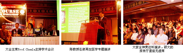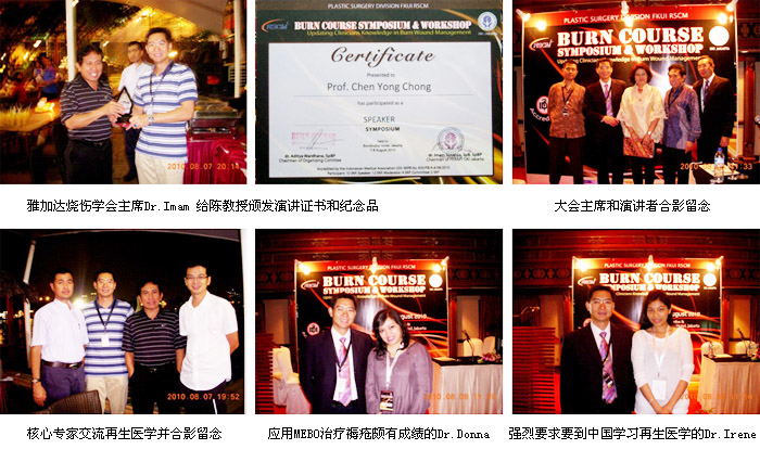 另外,在這次會議期間,除了來自中國的燒傷再生醫(yī)學專家陳教授做了燒傷再生醫(yī)學專題演講外,來自雅加達Cipto醫(yī)院燒傷整形科的Dr. Aditya Wardhana以“Topical Dressing for Burn”為題介紹了自己在燒傷治療方面的臨床經(jīng)驗和體會,特別向大家展示了他2008年到四川進修、學習燒傷再生醫(yī)學技術的親身經(jīng)歷,以及回國后應用燒傷再生療法成功救治的40多例燒傷患者所取得的優(yōu)異效果,很受大家的青睞;還有,來自Cipto 醫(yī)院燒傷整形科的Dr. Teddy在他的發(fā)言中也介紹了自己自2006年起,應用燒傷再生醫(yī)學治療頭面部、雙手、上肢及大腿深度燒傷患者的臨床經(jīng)驗,向大家展示了多例成功病例,從實際應用的角度證明了燒傷再生醫(yī)學的神奇性和優(yōu)越性。這次涉及燒傷再生醫(yī)學的、有國外專家和國內專家配合的演講成為大家關注的焦點和討論的熱題,會場氣氛非常熱烈,再生醫(yī)學演講把這次大會的學術氛圍推向了高潮!