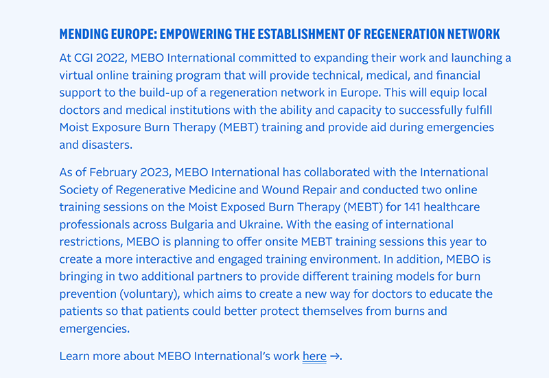 “歐洲修復(fù)計(jì)劃:賦能歐洲再生醫(yī)療網(wǎng)絡(luò)構(gòu)建”倡議是美寶國(guó)際在繼為亞洲、非洲、拉丁美洲、美洲等地區(qū)提供再生醫(yī)療技術(shù)培訓(xùn)后,擴(kuò)大承諾啟動(dòng)的歐洲公益行動(dòng)計(jì)劃。在歐洲建立再生醫(yī)療培訓(xùn)網(wǎng)絡(luò),并提供技術(shù)、醫(yī)療和資金支持,以幫助當(dāng)?shù)蒯t(yī)生和醫(yī)療機(jī)構(gòu)掌握再生醫(yī)療技術(shù)并具備在緊急情況及災(zāi)難期間提供援助和救助的能力。