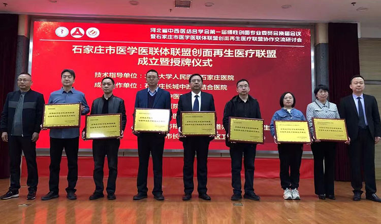 石家莊市醫(yī)學(xué)醫(yī)聯(lián)體聯(lián)盟創(chuàng)面再生醫(yī)療聯(lián)盟在此次大會(huì)上宣布成立。石家莊市醫(yī)學(xué)醫(yī)聯(lián)體聯(lián)盟是由北京大學(xué)人民醫(yī)院石家莊醫(yī)院牽頭成立的,此次依托石家莊市醫(yī)學(xué)醫(yī)聯(lián)體聯(lián)盟,成立了以技術(shù)協(xié)作交流為紐帶的專業(yè)聯(lián)盟組織。安雄彪副院長和方進(jìn)勇教授為聯(lián)盟第一批成員單位授牌。