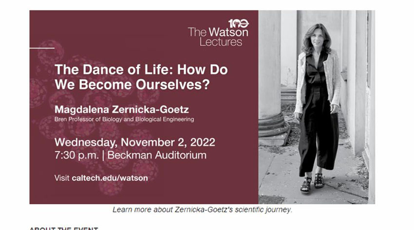 在2022年11月2日舉辦的加州理工學院一百年前設立的沃森講座(The Watson Lectures )上,加州理工學院遴選來繼承徐榮祥科學精神和路線的陳天橋雒芊芊神經(jīng)科學研究所發(fā)育生物學家、Bren生物學和生物工程教授瑪格達萊娜·澤尼克-戈茨(Magdalena Zernicka-Goetz)就“生命之舞:我們發(fā)育成人的旅程”進行了分享。該講座采用線下線上相結合的方式進行。