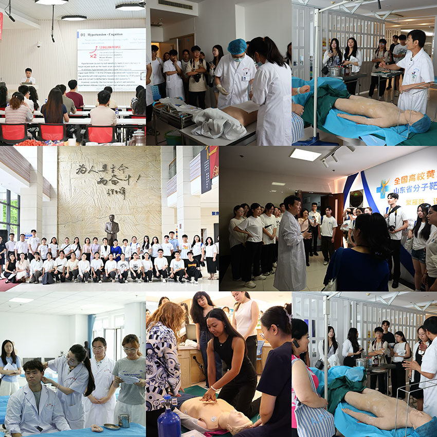 7月7日,本次訪學之旅在山東煙臺濱州醫(yī)學院拉開帷幕,師生們受到熱情接待,參與了隆重的歡迎儀式并參觀了校史館及榮祥樓,在徐榮祥教授銅像前共同獻花,深切緬懷這位再生醫(yī)學領域的先驅。在煙臺期間,行程豐富而深入大家開啟了學術碰撞,在護理學院、第一臨床醫(yī)學院組織了多場英文學術匯報,主題涵蓋腸道菌群與高血壓認知、mHealth在HIV預防中的應用、徐榮祥再生醫(yī)學理論探索等前沿領域,中美師生積極互動。