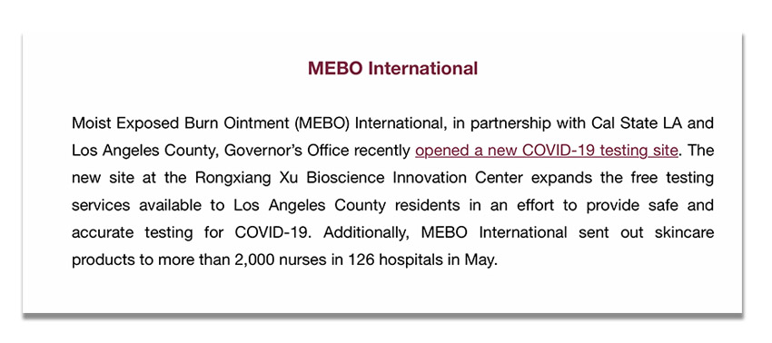 日前,美寶國際應對新冠肺炎疫情的舉措作為典范被非營利組織Concordia特別推薦,重點介紹了加州州立大學洛杉磯分校徐榮祥生物科學創(chuàng)新中心設立為新冠肺炎免費檢測點,為當?shù)厣鐓^(qū)提供安全的COVID-19檢測,幫助阻止病毒的傳播,在新冠肺炎流行中發(fā)揮的重要作用;以及美寶國際為126家醫(yī)院2000多名護士提供護膚品的愛心舉措。